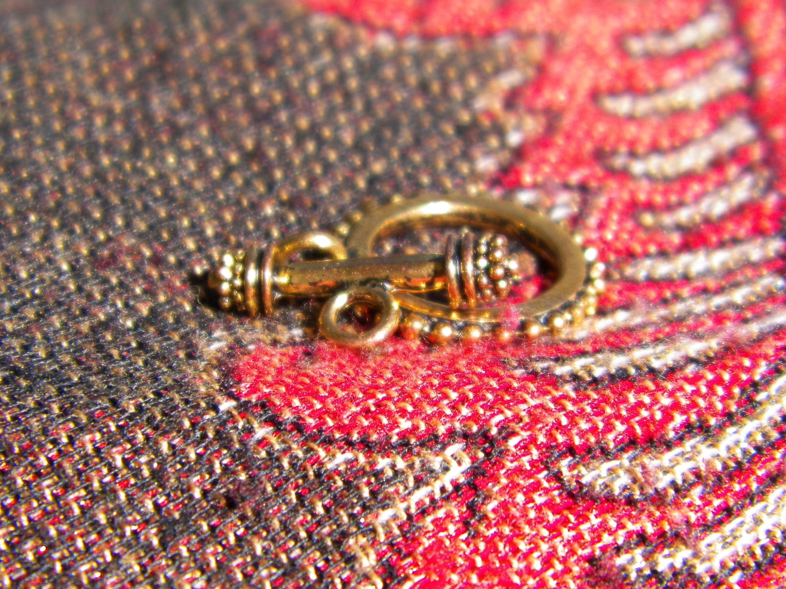 The closure can sometimes be the most difficult part of the piece. Unless you’re into doing piercework on gold (and as of the writing of this entry, the price of gold is $1,761.25, so not feasible for many SCAdians), or can find hooks that work (and I’ve had a very difficult time finding those that might work), toggles are sometimes a great compromise point, especially since most people won’t look for the toggle in the first place. I specifically chose a toggle with granulation, as this is a period technique. This brings me to the point of jumprings, and why I have them listed. I like using jumprings to attach the necklace to the toggles, as it can be difficult to allow enough room for the toggle in the technique of wire-wrapping the links. By using a jumpring, it allows flexibility to use the toggle in opening and closing the necklace, reduces the chance of metal fatigue on the link, and if one wishes to replace the toggle with something else (like a hook and eye closure, which is more similar to the one on the extant piece), they can.