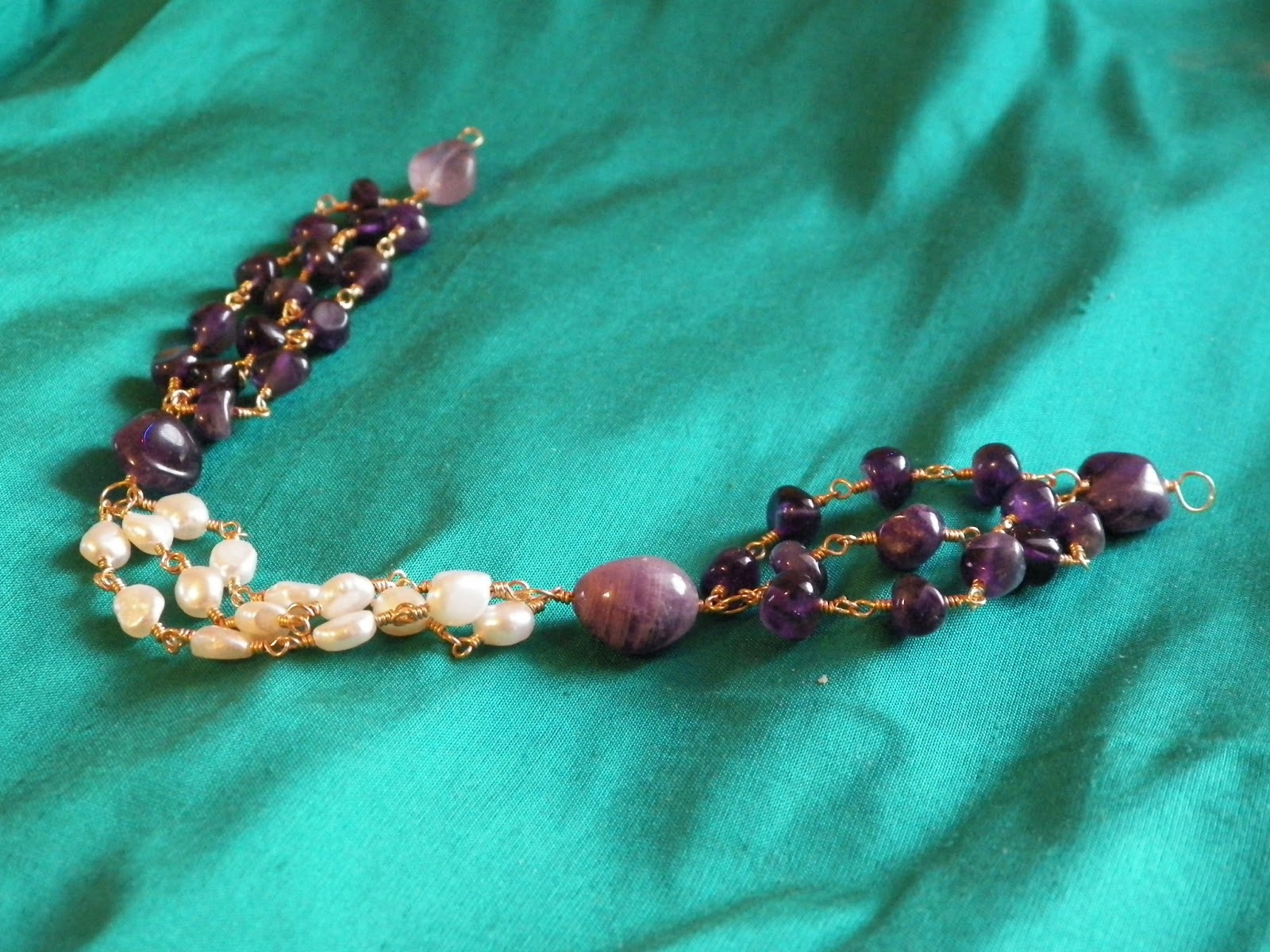 At the same time, I’ve finished another piece – the bead-along piece. It will be headed off to its owner soon (my friend Anna, of Anna’s Rome). You might notice the change in the green materials – I found some agate or bloodstone (I can’t remember which it is) and used this as my emeralds still have not been recovered. I find it interesting the simplicity of this single strand between locations in the time-space continuum, but at the same time, the similarity of materials only affirms the Roman aesthetic and use of colour between cultures. It is utterly fascinating to me.So, back to the Gallo-Roman piece: it’s very nearly complete. I will need to do another set of the freshwater pearls, and then another set of the amethyst, and then I’ll have to figure out what I’m going to do about the clasp, as I haven’t found an acceptably-shaped bead yet. If needed, I may see what I can do about getting some Precious Metal Clay in gold, and make two leaf/blade-shaped beads to put on wire and to use as the clasp.