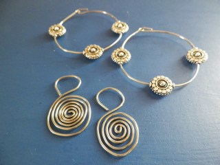 So, I made temple rings. The bottom set is based on the Viatachi-style rings, which are pretty much spirals with a hook going in the opposite direction, and the other set is inspired by sets found near the upper Volga River (link to an interesting site about temple rings is here). The wire I used is commercially drawn permanently coloured copper wire in either 14 or 16 gauge. (I don’t remember which one it is, but it is very thick and somewhat difficult to work with, but I like the results. And the metal beads were on sale – they remind me a little of sunflowers with the large round middle encircled with petals. I shaped these with pliers, and with the rings with the beads on them, put the beads onto the wire, and then shaped it just enough so that the beads wouldn’t move around a lot. They still move, and had I experience in using a soldering anything, it may have turned out differently.