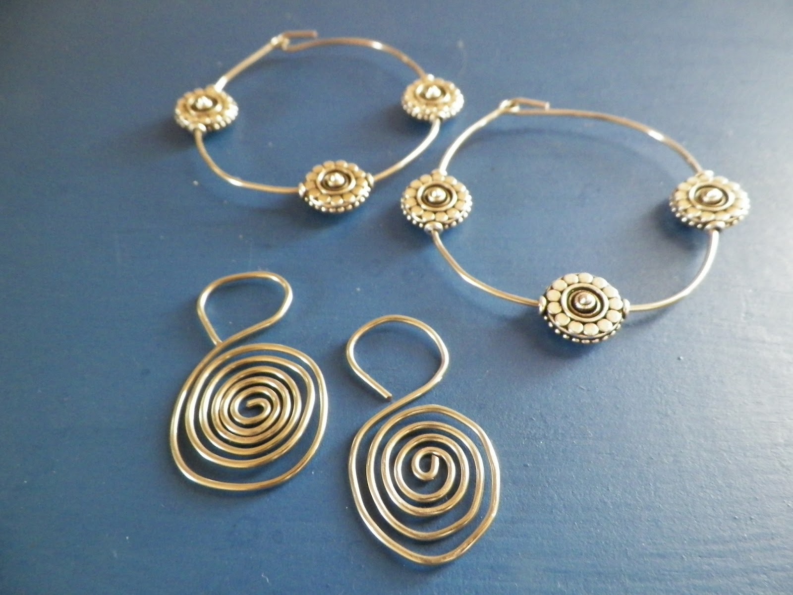So, I made temple rings. The bottom set is based on the Viatachi-style rings, which are pretty much spirals with a hook going in the opposite direction, and the other set is inspired by sets found near the upper Volga River (link to an interesting site about temple rings is here). The wire I used is commercially drawn permanently coloured copper wire in either 14 or 16 gauge. (I don’t remember which one it is, but it is very thick and somewhat difficult to work with, but I like the results. And the metal beads were on sale – they remind me a little of sunflowers with the large round middle encircled with petals. I shaped these with pliers, and with the rings with the beads on them, put the beads onto the wire, and then shaped it just enough so that the beads wouldn’t move around a lot. They still move, and had I experience in using a soldering anything, it may have turned out differently.