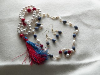 The necklace I used sodalite, freshwater pearls, coral, plated spacer beads, and a handmade hook and eye clasp, using 18 ga brass wire. The matching earrings use sodalite, plated spacer beads, and fancy headpins on shepherd hooks. If I had a jig, and the right sort of wire, I would have probably made the hooks myself – but that’s neither here nor there.