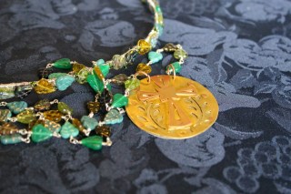 While the wreath is not based on anything in particular within SCA-period history, the techniques I used on the chain are the same wire-wrapped links that are used on Roman and Byzantine jewellery. As for the pressed glass leaves, I’m not sure the periodicity of them. I’d have to do more research.