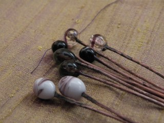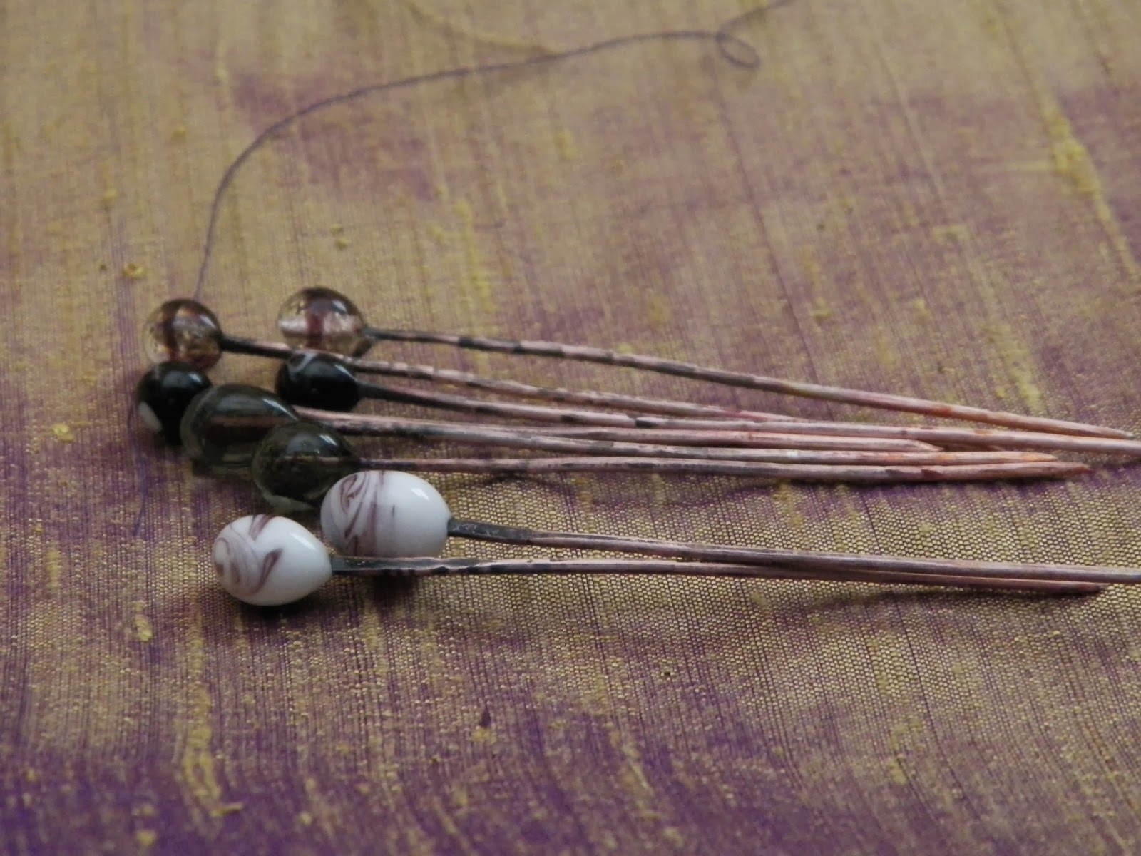 You see, I found those glass veil pins from the 12th century (with similar ones made in the mid-14th century that were excavated in London). And purchased some more wire and played. The wire I purchased is not what I wanted to use: it’s coated copper wire, which was scraped off when I sanded the pins into shape, but, I’m otherwise pleased. They’re a bit big for veil pins, but there are other things to use pins for, including attaching items to clothing and to act as decorative items.