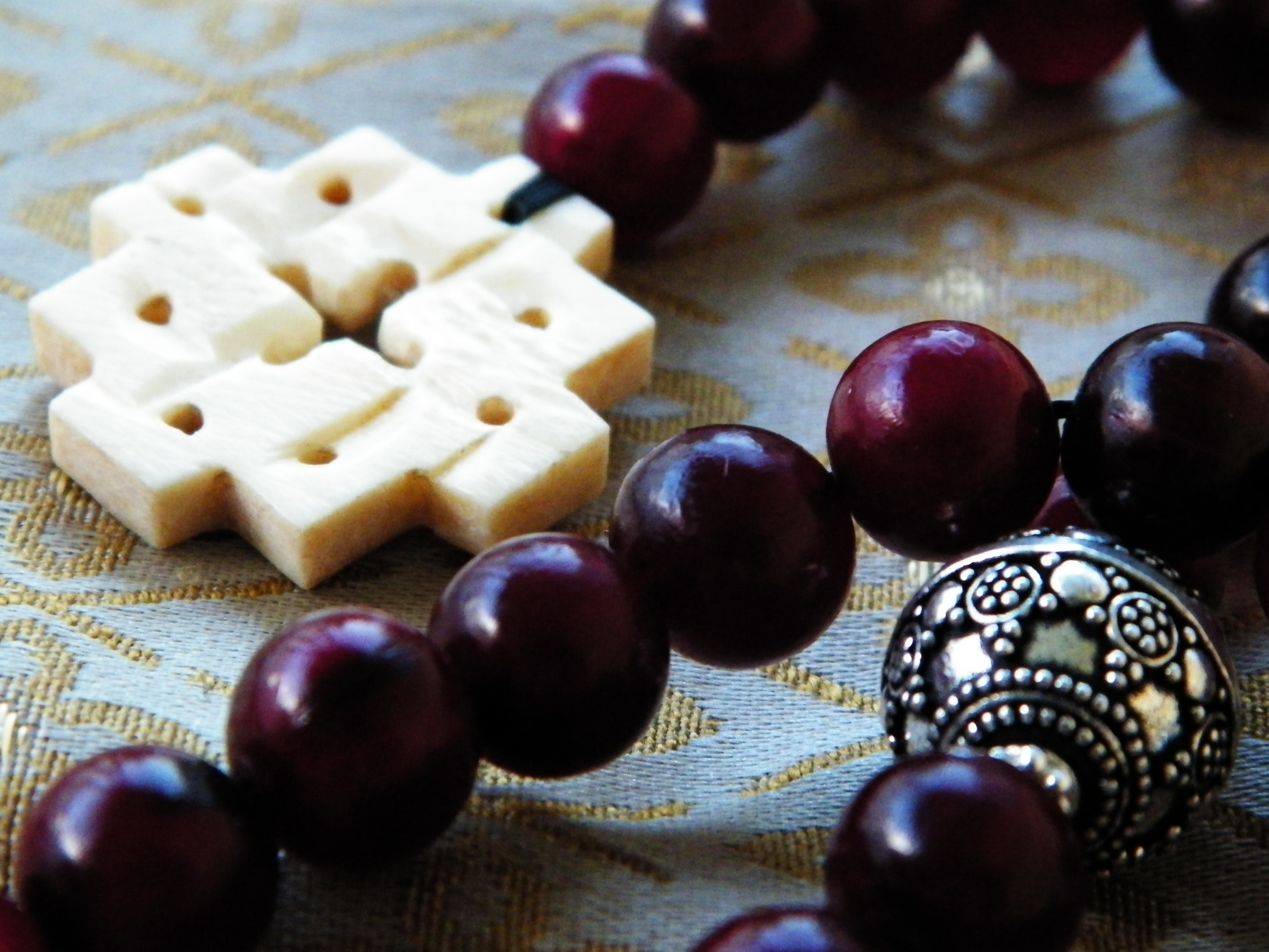 It’s true. I can’t go to a bead store without finding something that I’ve fallen in deep lust with, and over the weekend was no exception. I found some gorgeous red horn beads as well as some silver-plated granulated beads, and with a bone cross that I already had at home, and after threading them on silk, I had a paternoster that looked pretty close to some exemplars that I’ve seen.
