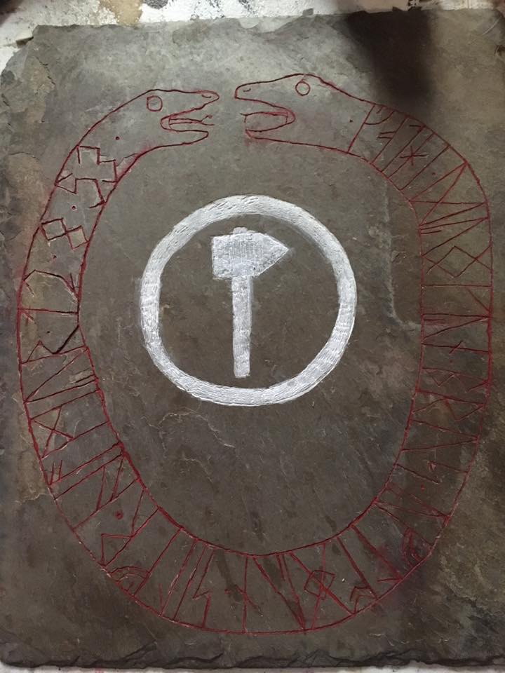 Once the badge for the order was in and painted with Liquitex Titanium White ink, I started carving in a double headed snake from Logan’s heraldry to better key into something that would be uniquely his. It would also allow space for some text, like in stone U 611, found at Tibble. I ended up transliterating the runes into Elder Futhark as I did not have time to get a full translation, with the inscription reading “Gothi Duncan Bruce of Logan – Silver Hammer” with the date in an angular numeral style (as the Norse generally didn’t use numerals). I did run into a few issues with some of the parallel plates cleaving off and going a bit deeper than I would like (like what you can see in the photo), but the text could still be made out. Once this was done, I started inking in the snake and text with a brush and some Liquitex Napthol Crimson ink. The benefits of using an acrylic ink means that the colour is bold and fairly loose, but also some lightfastness, as well. Having a loose ink means that capillary action could pull the ink down the carved channels, which means I didn’t need to use a lot of it and that it would stay where I wanted it.