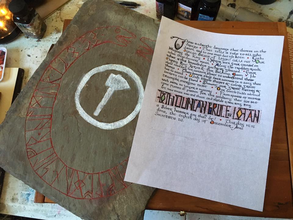 This scroll taught me a few things. One, if I have nothing stopping me, I can get a scroll (really, two) done in a week. Two, working with slate really is quite fun, and three, at the end, it’s all for the recipient, and seeing his face was worth it.