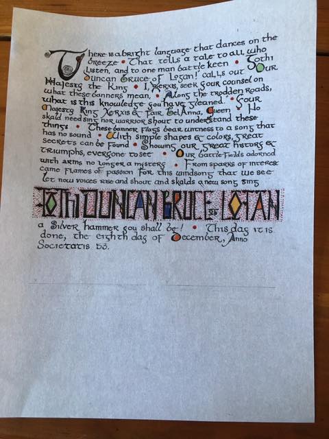 A bunch of preprints for TRM Ashir and Ashland to use. And the preprint workshop at Valor helped Their Majesties out, too. I may have to hold more of these in the future. - Baronial roll of arms project. (this is honestly an ongoing project, but it’s fun to see how far it’s come in the years we’ve worked on it. We’re up to 86 completed banners.)