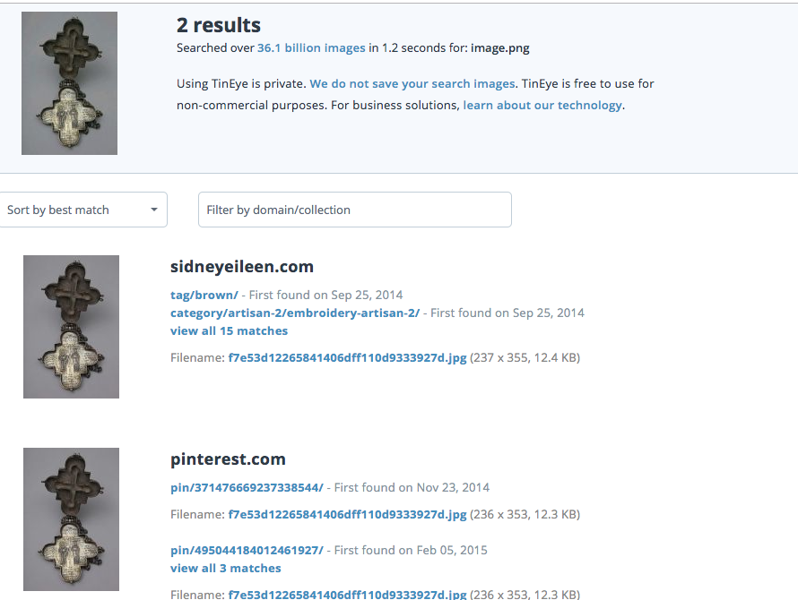 Copy and paste the image (or you can also download and upload it to the search), and then, if you’re lucky, you’ll get some responses. Very lucky me, I got some results (only two), but I was able to see where the rest of the links were. In this case, the Pinterest links actually led me to another board, where it was linked to the actual piece, found here.