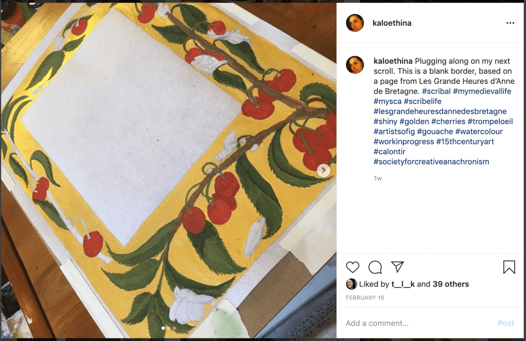 Instagram is great for showing off processes, or documenting what you’re doing. It is, however, terrible for citing items. (But hey, if you want inspiration, Instagram is wonderful. And I find that medieval Instagram is delightfully supportive and I love learning from them!) Medieval Twitter is similar, and with organizations like the British Museum and the Walters actively sharing what’s in their collections (with enthusiastic curators often answering questions!), it’s a great place to learn. Downsides include word counts and clunky searches with tags for the exact item you might want. (and, if you’re particularly tied to something, yes, you can cite Tweets using Chicago/Turabian manuals of style.
