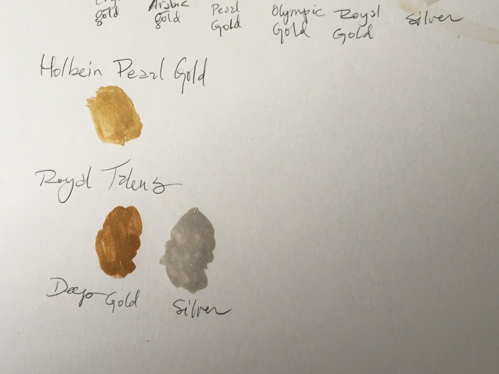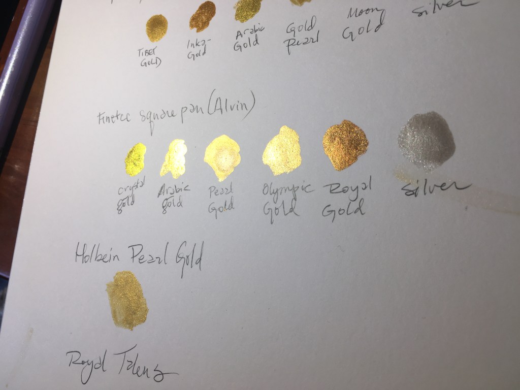 I’ve gathered the gold I have on hand and have taken photos of how the paint looks dry. I used Fluid’s hot press 140 lb/300 gsm block, not pergamenata/vegetable vellum, mostly to show the types of gold on light-coloured substrates, but also because it’s a similar smooth texture to perg. I have, however, experienced pretty decent coverage on pergamenata with all of these paints.