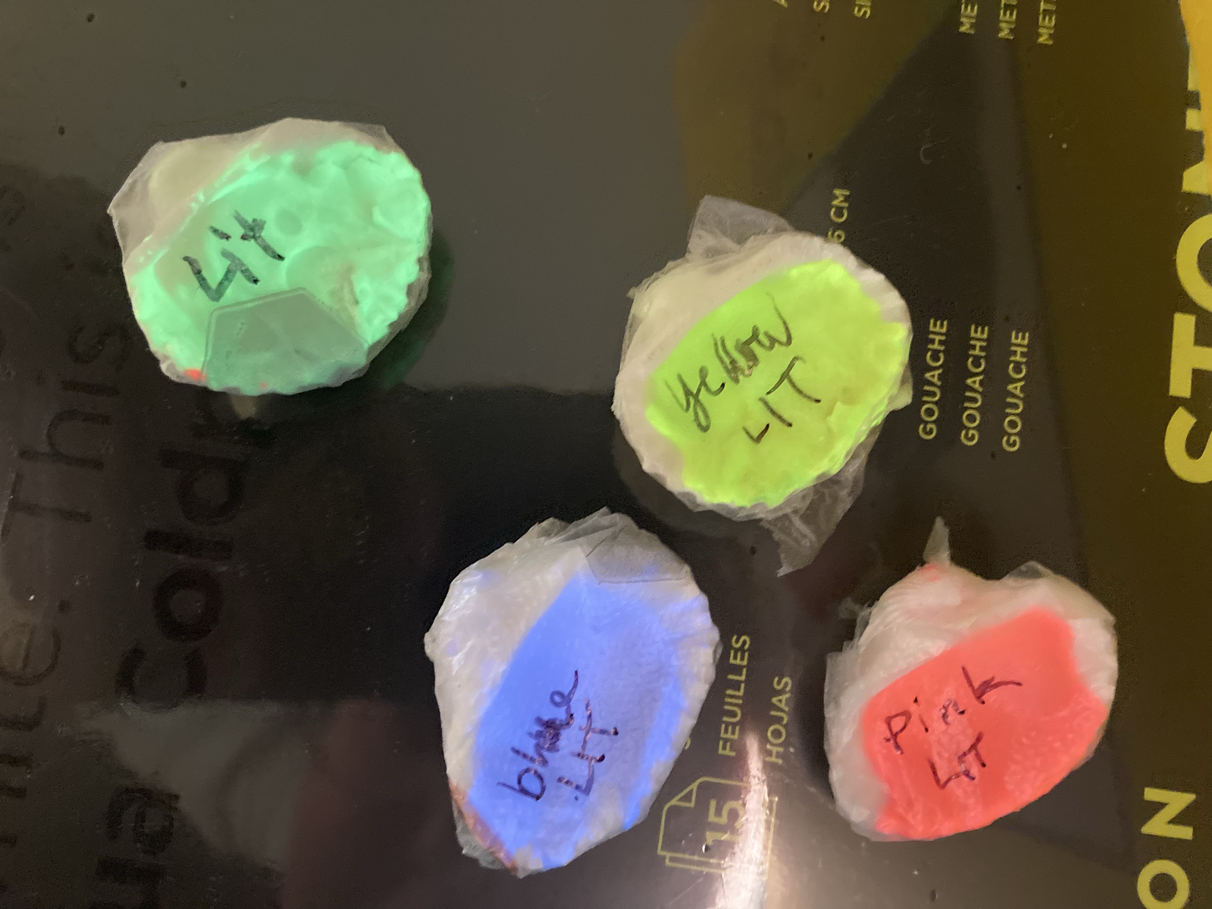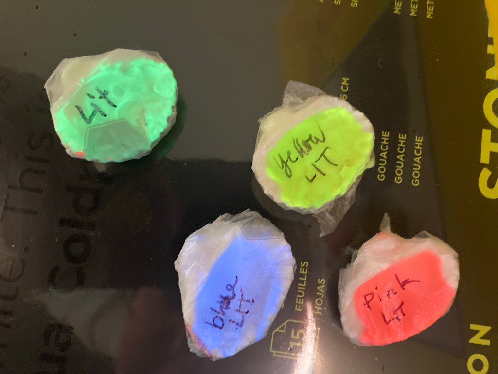 That said, I also am prone to shenanigans and malarkey, especially when I’m allowed to be a giant goofball. This scroll allowed me to be that giant goofball (when you know the recipient that well, sometimes you get some liberties). A few months before I was assigned the scroll, I purchased some LIT powder from Stuart Semple. It’s a relatively stable set of glow-in-the-dark pigments meant to mix in with everything from acrylic paint base to resin and all things in between. I wasn’t entirely sure I could mix it in as gouache, as some glow pigments react poorly with water, but this is why one experiments. That same shop night, I made a very small batch of blue LIT gouache with commercial binder (yes, I know I could make my own binder, but when the commercial stuff is already pretty close to a period recipe and saves me time in making my own. . . ) to see if it would work and it did. Honestly, the only difference between the period paints and the not-so-period glow paint is the pigment – the binder and the storage methods were period. A plan began to form.