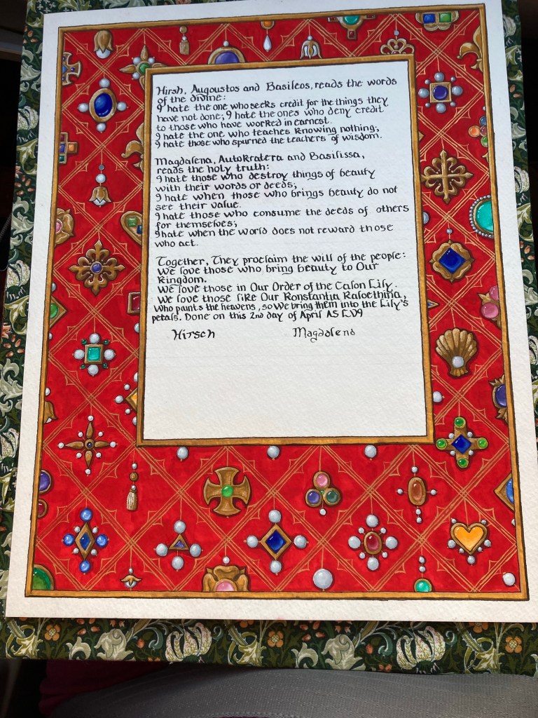 So, I heard my name, and knelt before Their Majesties. Her Majesty Magda went on to talk about the three scrolls that I had painted being used in that day’s court (two AoAs and John’s Silver Hammer), the blank borders I had painted, the paints that I had made and shared and brought with me, and the little manuscript page from the Nelson-Atkins that won the A&S competition at Gryphon’s Fest the prior October. She mentioned that while They had planned to grant me this particular award at Queen’s Prize (which was somewhat up in the air for me to attend), They also noted that I was at this event, and that They had waited more than enough time and they wouldn’t wait any longer. And that’s when the Order of the Calon Lily (Calontir’s grant level award for the arts) was called in. (The Royal Scribe, Violet appeared on my right side and told me I wasn’t allowed to cry on the scroll. I almost did.) I’m still a little in shock. The scroll I received is absolutely stunning – and while it doesn’t contain the badge of the Order, I’m kind of a bit scared to attempt to paint it, because it’s absolutely amazing. That said, I’m just as surprised as anyone else (seriously, I never thought this day would come), but I am so grateful to the Order and to Their Majesties for making me a part of it. I love that the text for my scroll is full of hate and spite and yet love. I love the intense beauty of it. And I love that my friends are all just as tricksy as me.