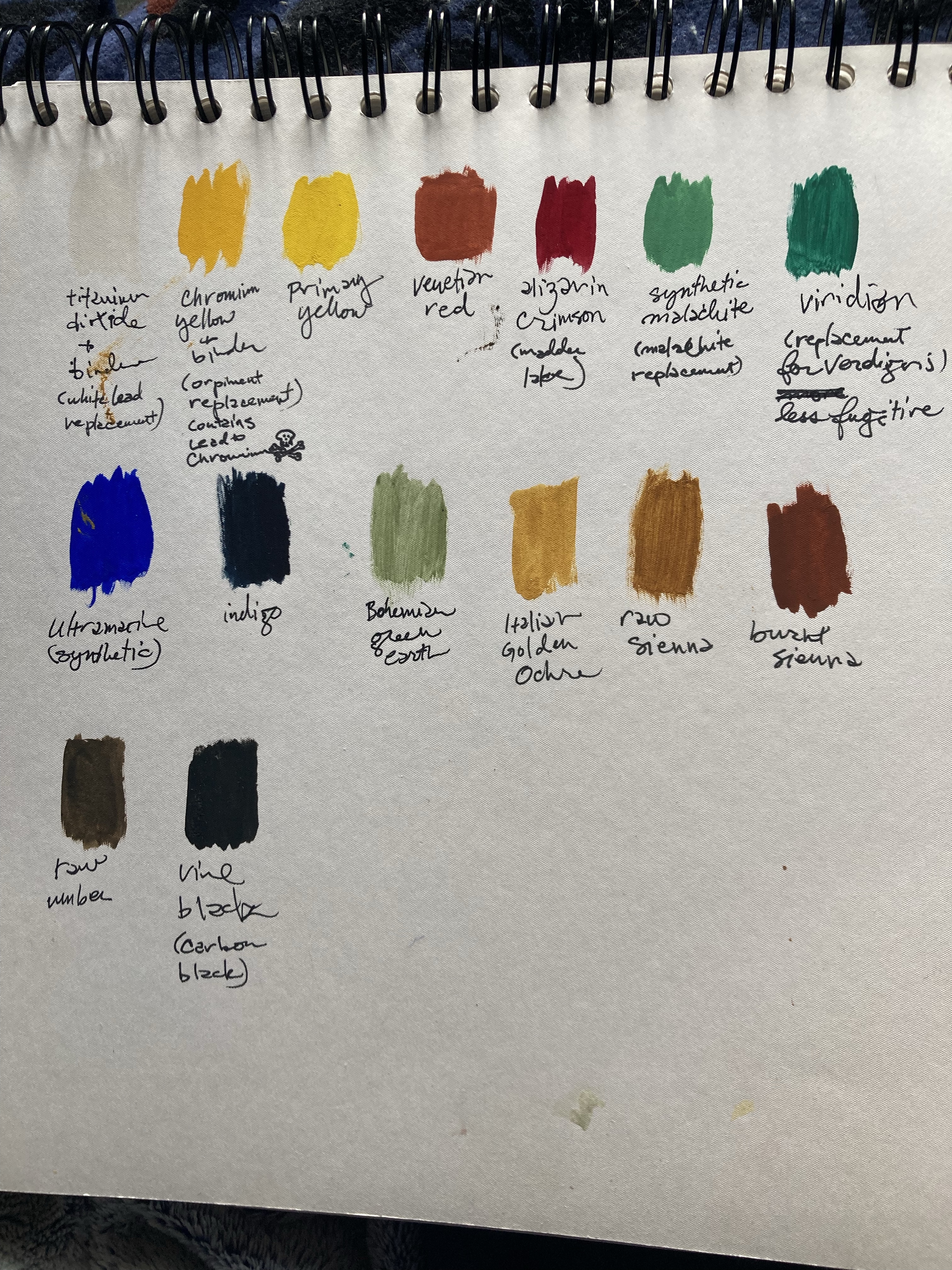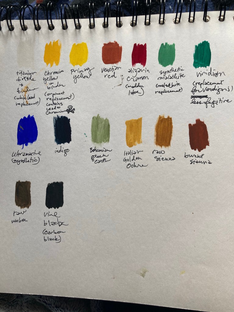 So, I set to work at a workshop night hosted by a friend, where I made several different paints not only for my project, but also for another friend’s project so she could use period (or good, safe analogs to) paints. As I am also incapable of making small batches of just about everything, I was also able to make at least one demonstration set of paints for another friend out of the paints that I made that night. It was a good shop night.