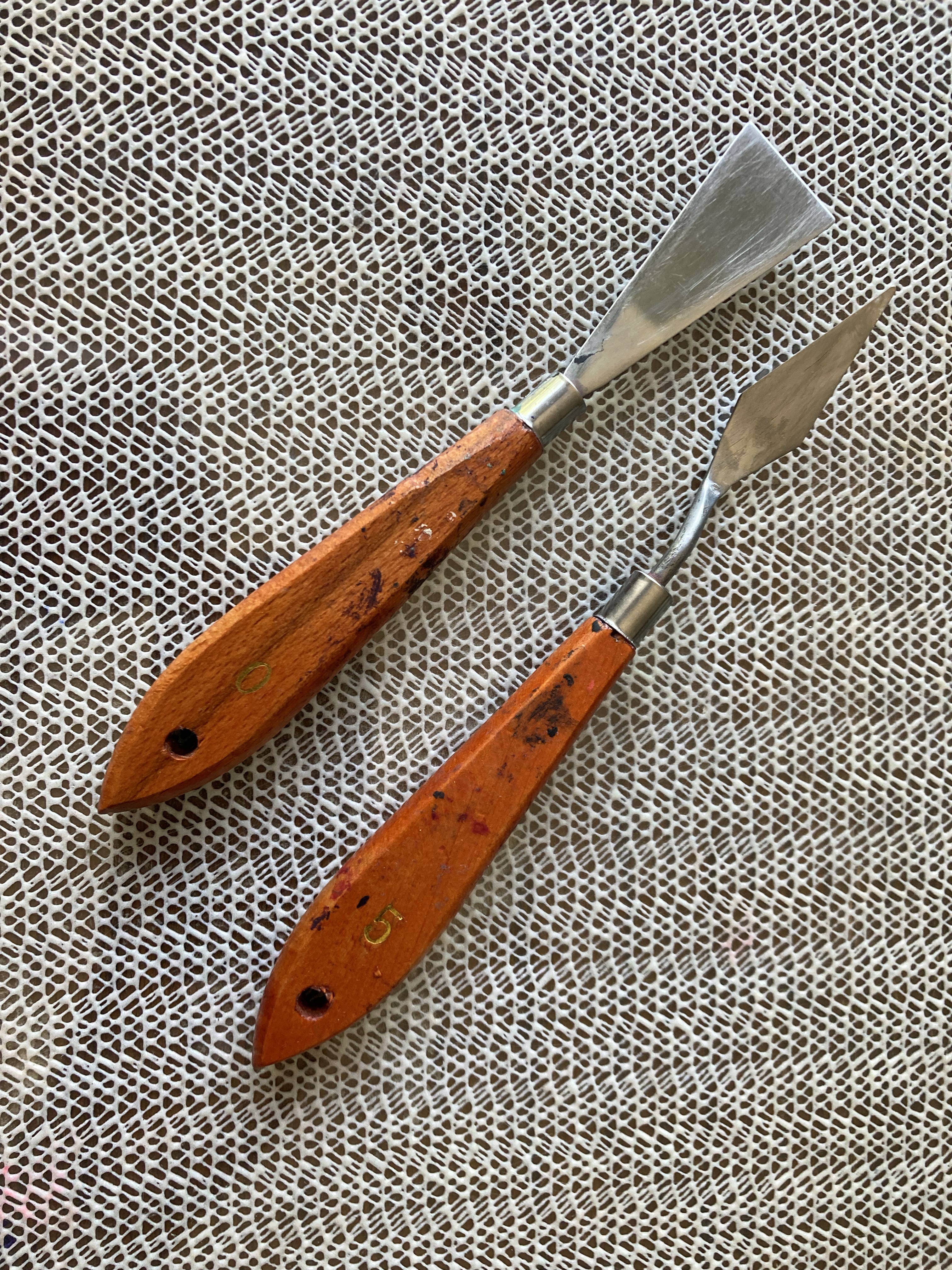 Palette knives. I got mine out of a pack of three, but most of the time, I only use these two, and yes, plastic palette knives can work if you’re starting out. You’ll need them to help gather up paint, mix pigment in with the binder, scrape the muller down, and push paint back into the middle of the slab. These are absolutely necessary. I generally stick to these two shapes, but if you have a fairly flexible knife to mix and a fairly stiff one to help scrape, you’re pretty well golden. I have heard of some folks using cake spatulas to mix paint and a small bench scraper to get paint, and I can see it work (albeit messily), but my biggest caution is to not use that spatula for food ever past mixing paint up.