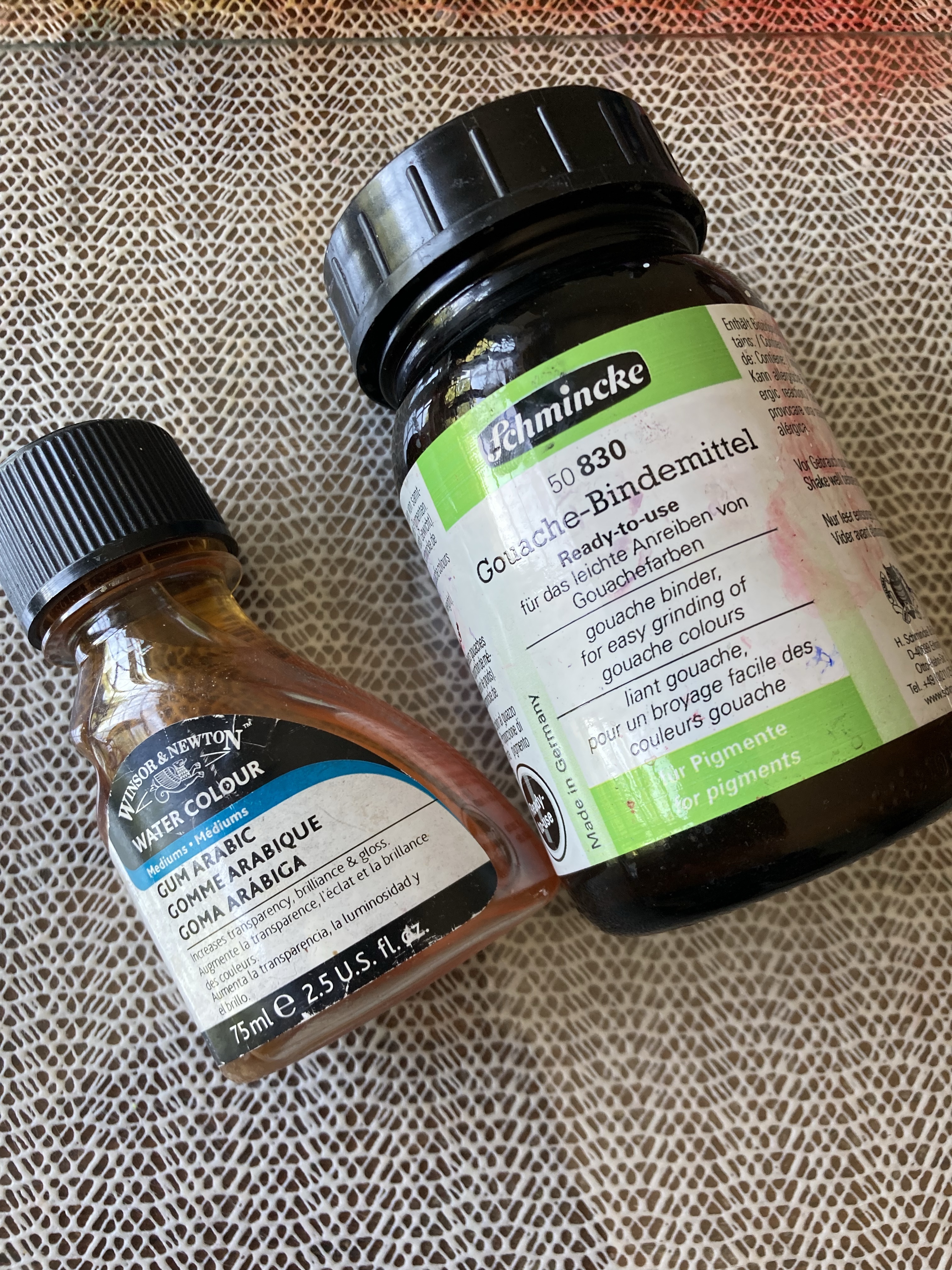 Binders. I’m a huge fan of Schmincke’s gouache binder, but there are recipes out there that use gum arabic and honey, but the Schmincke binder really does work fantastically and consistently. Also, it’s relatively inexpensive for the amount of binder that you get, especially when looking at how much gouache you are able to make. The downside is that the only people I’ve found who can keep it in stock are Blick, and even then, I still have to order it as my local store does not keep it in stock. Definitely call your local art stores to see if they keep it in stock.