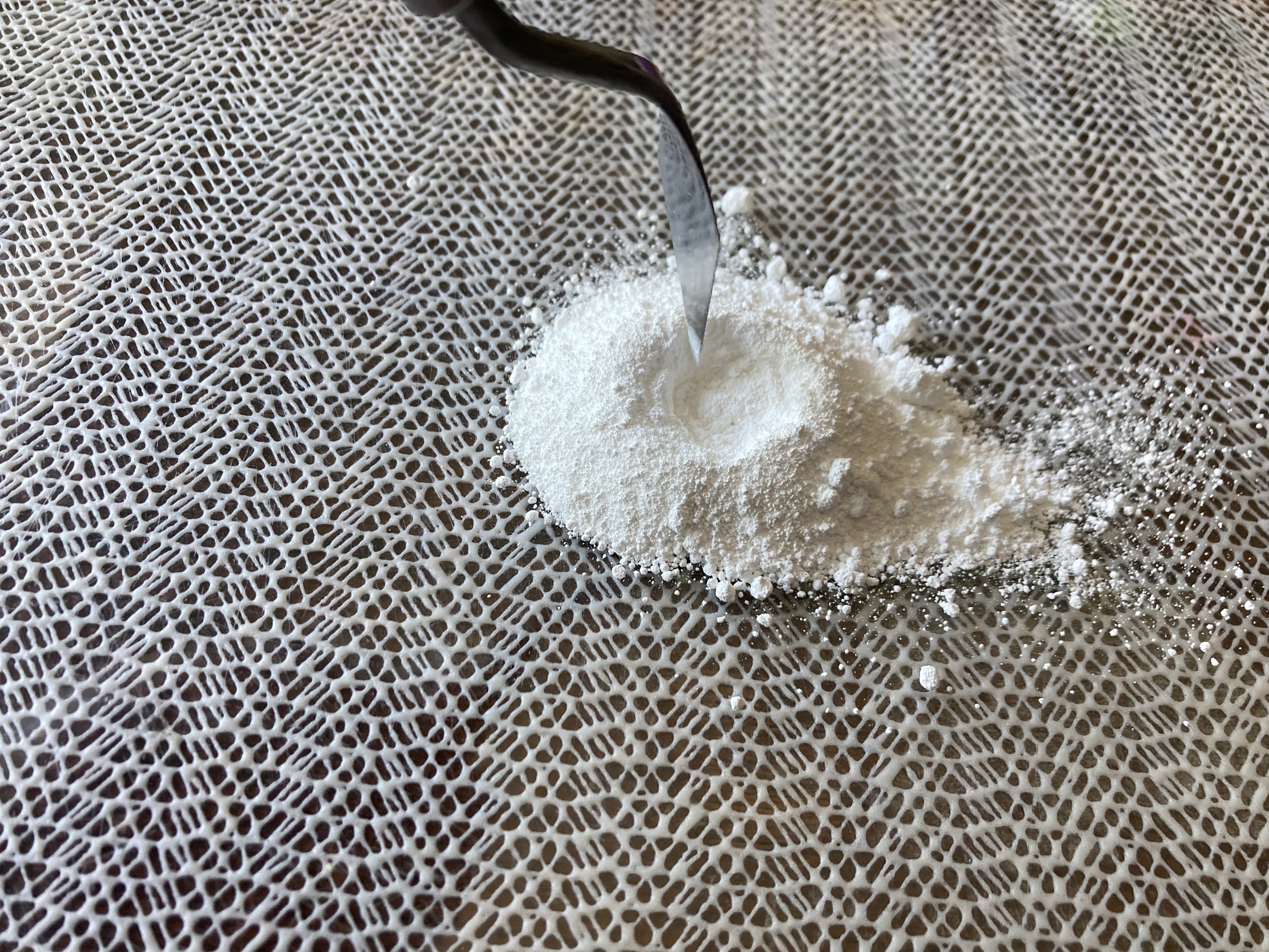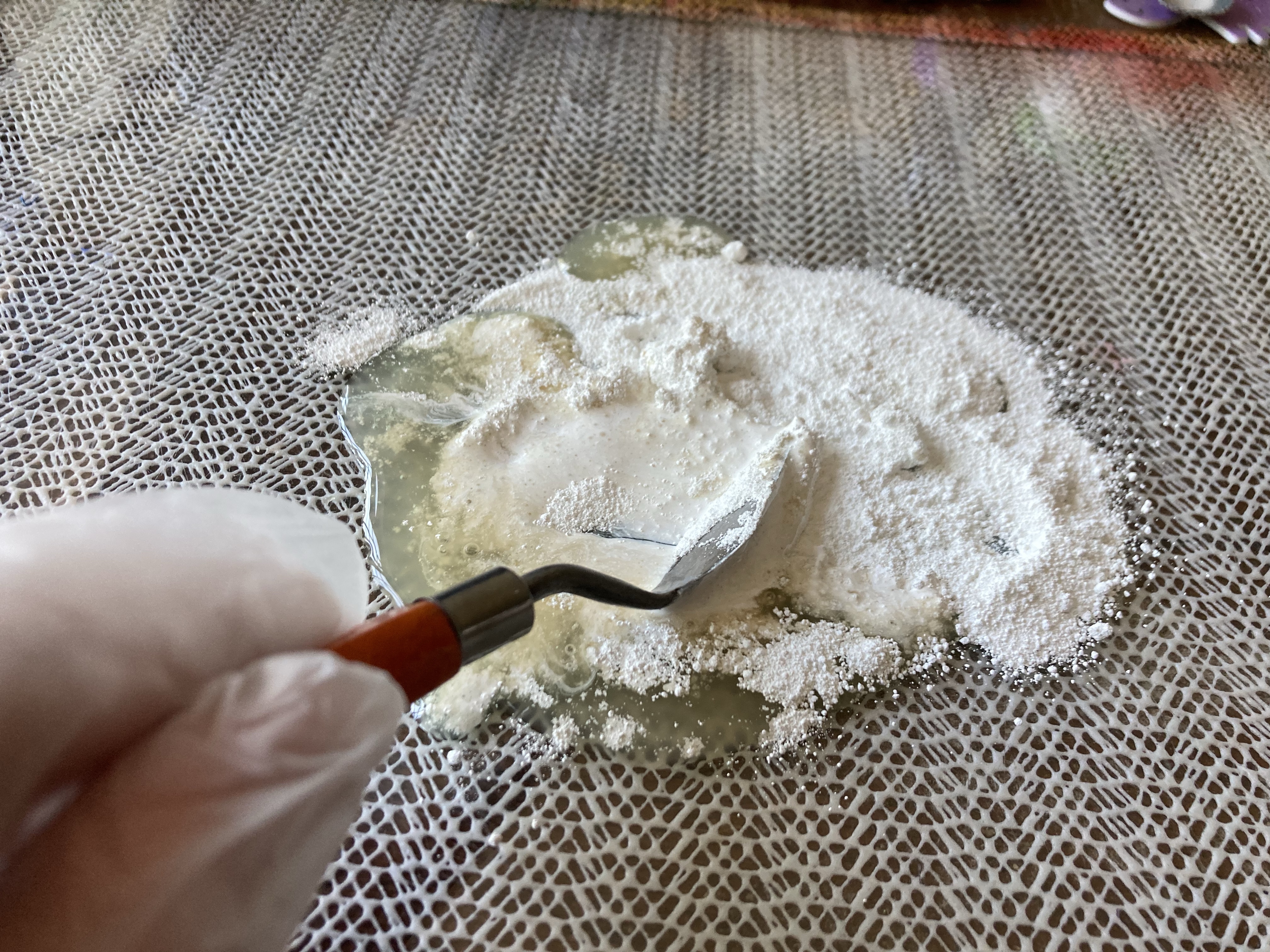 Step 3: put a little bit of pigment on your slab, making a small divot in the pile of pigment. I called this step “making forbidden pasta,” because it very much looks like making the flour volcano in the dough-making process. This little divot will help contain some of the binder, though just kind of be prepared that that it can and often will kind of spill out. It’s okay, as all of the pigment will eventually need to be incorporated into the binder.