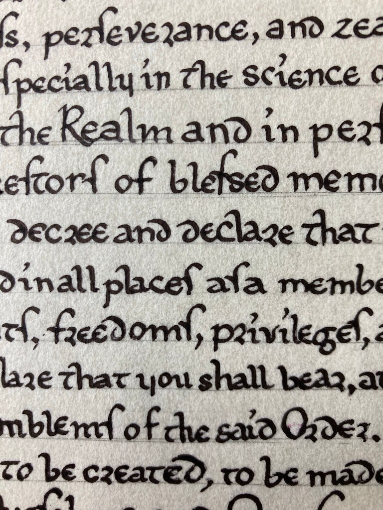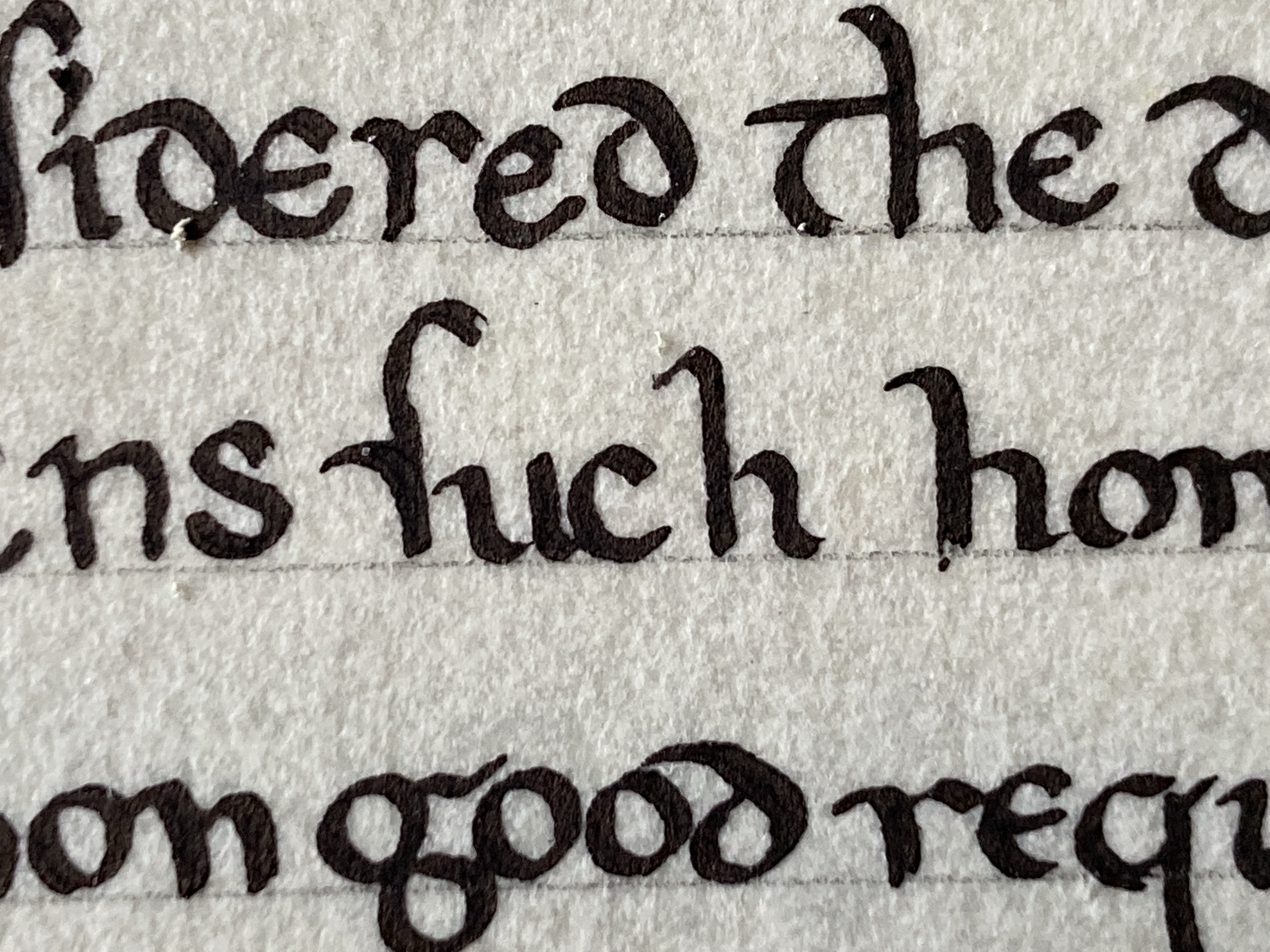 More about creating the ductus – I looked at individual letters in the extant, and if I could replicate them (I could, for the most part), and on a scrap piece of paper, and then I used this piece of paper to inform me of how I should form my letters. Of note, it was fun to create alternate letterforms for s, r, and others, but not as fun to go back and scrape when I forgot that I needed to stick with the letterforms. (It’s better to let things dry before scraping, and it’s even better to attempt the letter it should be, let it dry, and then scrape carefully around the letter. Especially on perg. Otherwise, it’s scraping everything and then burnishing everything, and I’ve never been particularly successful with that.
