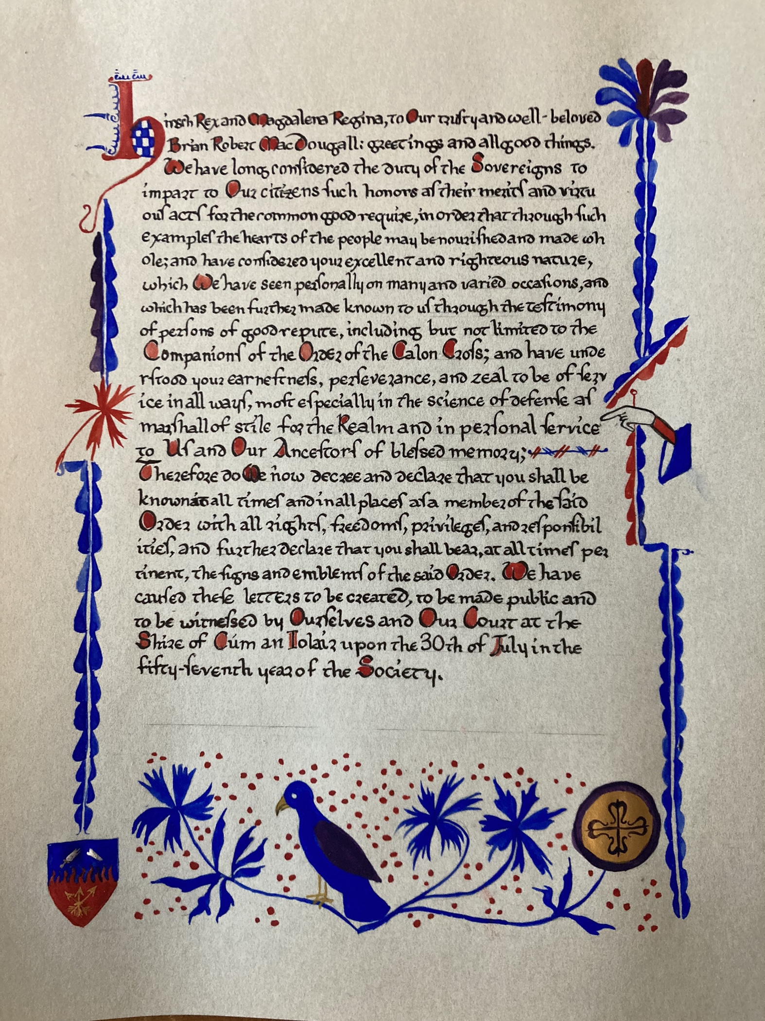 One of the things I particularly loved about this scroll was that everything was basically in the same case – capital letters were marked with a bit of paint. I suspect the extant actually used ink, however, I had paint, and I loved the bright red with the cool tones of the ultramarine. One of the things I did do to make the paint look more like ink was watering it down, and then using it with a fairly watery brush. I just had to be aware that the ink I was using was not waterproof, so I had to use it very carefully. I also loved using the hand element (pointing to the word “service” as Brian was being inducted into the Order of the Calon Cross, Calontir’s Grant order for service).