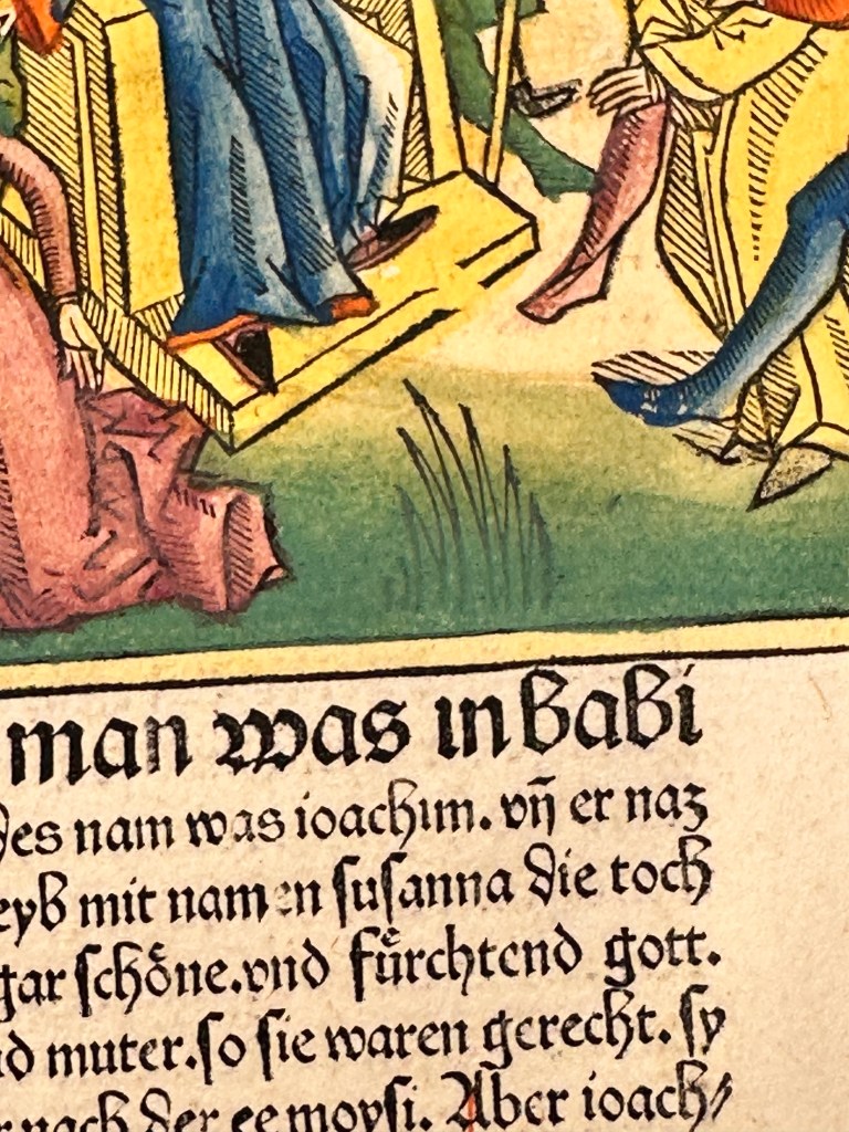 Anyway, once I got the pigments all smashed up, I added enough binder to basically get it to paint consistency. I did struggle with the exhausted madder (I may have put too much binder in, because the pigment load isn’t great, but it’s a very very very soft pink. The yarrow, Queen Anne’s Lace, and the onion, though? Nice soft pastels (the onion’s pretty brown, but I can use it!), and the Queen Anne’s Lace when mulling it was a lovely vegetal scent mixing it into the binder. Rather springlike, actually. The lake pigments all tended to be fairly translucent, which again could be based on the pigment load. For applications, these would be great in a style like a Koberger-style incunabule, where lighter paint washes went over a printed page. (this, by the way, is pretty good stunt documentation for Calontir’s preprints.) I could also use these in subtle colour glazing to create depth and dimension in botanical styles.