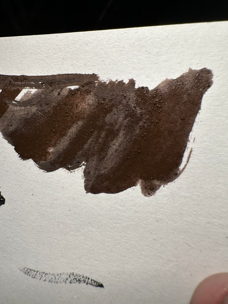 But here’s the thing: indigo is a fairly lightweight pigment, whereas the hematite is *not*. I ended up creating what’s called a granulating paint. So, like the alizarin and the ultramarine paints, which the individual pigments end up having different weights due to the relative material components of the pigments, the painter gets interesting textures depending on the relative weight of the pigments. (Seriously, this is a thing in watercolour painting – some people actively seek out granulating watercolours to bring in unusual textures to their painting. Gouache typically doesn’t entirely granulate unless you’ve watered it down enough but it can still happen.)