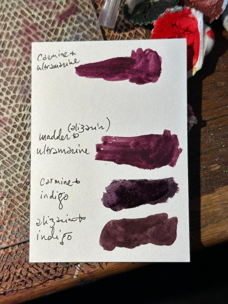 These two purples were my go-to for a couple of years. And then I got carmine, which is made from kermes lice (the word carmine comes from a Latinization of the Arabic word for crimson, which is kermes). Because I’m me, I refer to this colour often as “bug butt red,” because kermesic acid is extracted similarly to carminic acid from cochineal: pouring hot water on the dried insect (which was crushed into a powder) and laked with a metallic salt such as alum, then filtered and dried. Again, I mixed this up on the slab with both ultramarine and with indigo, and both with surprising results.