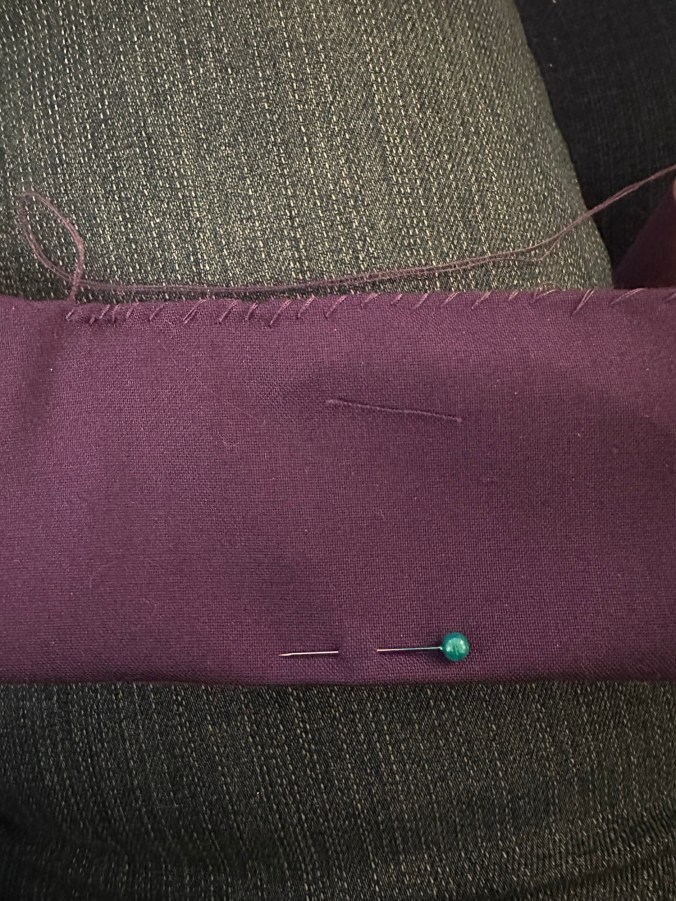 Second thing I did was cut out the fabric. Normally, I would have laundered everything (because that’s the order of operations for most apparel), but the stiffness of the sizing in the fabric actually helped me out a lot with keeping everything smooth and ready to work with. To make sure that the taj would stay on my head, I layered a ribbon in between layers of very thin batting (which also helped to keep the front smooth and give a more hat-like appearance as well as giving the fabric something to sew into.) I also made several small cuts to help with releasing enough tension in the fabric to allow it to lay flat. This took a while, but this is why podcasts and binge watching television was invented.