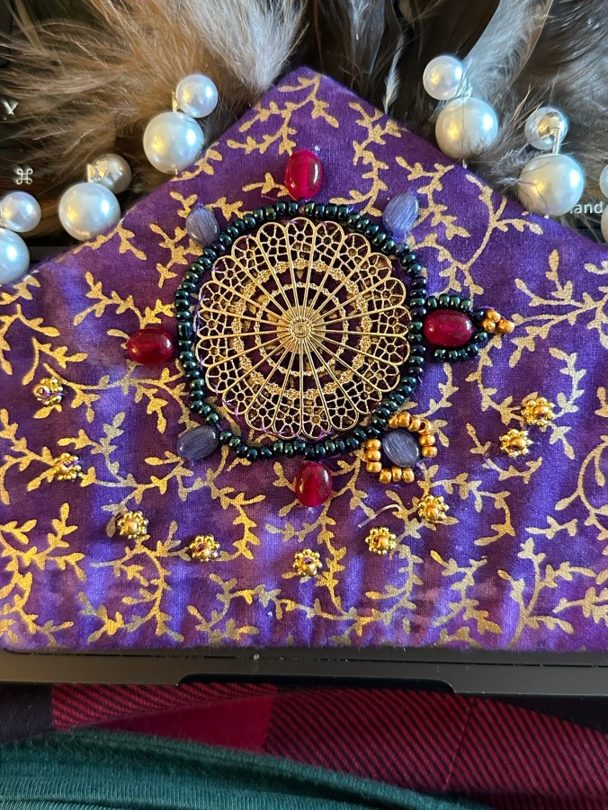I also carefully whipstitched around everything with very, very, tiny stitches. Once the front was done, I went back over behind everything and stitched down a backing fabric to better hide everything. I used a more plain purple fabric for this because it really wasn’t going to be seen. The other thing that this would help with later was doing the work with sewing in the feathers and the beads. This was sewn in using very tiny whipstitches into the fabric that had been whipstitched down. Again, it wouldn’t be shown, but it definitely made me feel better by keeping things nice and neat, and by leaving enough ease in the fabric, the flexibility of the fabric and the plastic canvas would be smooth enough when tied into a hat and thanks to the ribbon (about an inch wide) that was sandwiched in between the layers, I had a way to keep the entire thing as a hat. (also, it flattens for travel or storage, which is also really nice.)