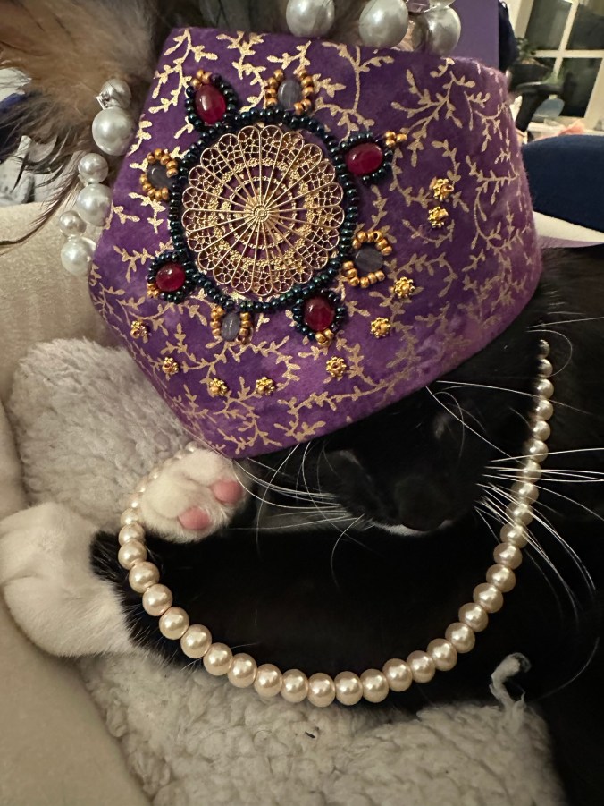 The final hat came together pretty well. I still have to finish the braid case (I cut it out too short, so I get to add some more length to it), but the taj itself (modeled by my very patient cat) turned out pretty well, and the colour harmonies worked in a way I was happy with, and it fit the general aesthetic of the Purple Persian. (Normally, I’d do something that has a bit more colour, but also, it’s the Purple Persian, so.)