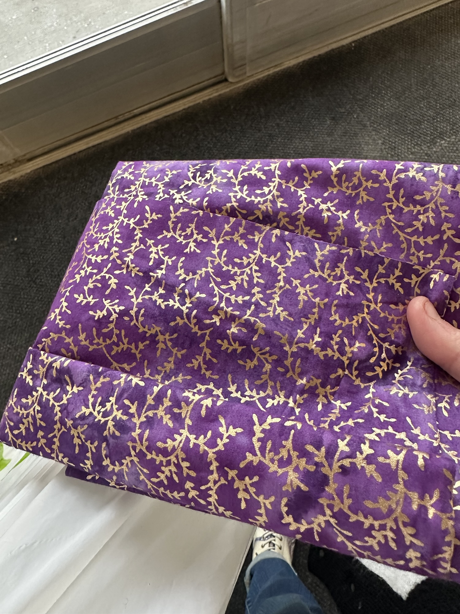 One, I found this premium cotton on Jo-Ann’s website (RIP Joann) because I wanted to make a braid case (which is a project still on the back burner) and I fell in love with it. Is it period? Nope. Did I feel it went with the aesthetic I was trying to go for? Yep. I also felt it went with the fabric I already had. Also, these are leaves on branches. They aren’t laurel leaves or wreaths. They’re branches.